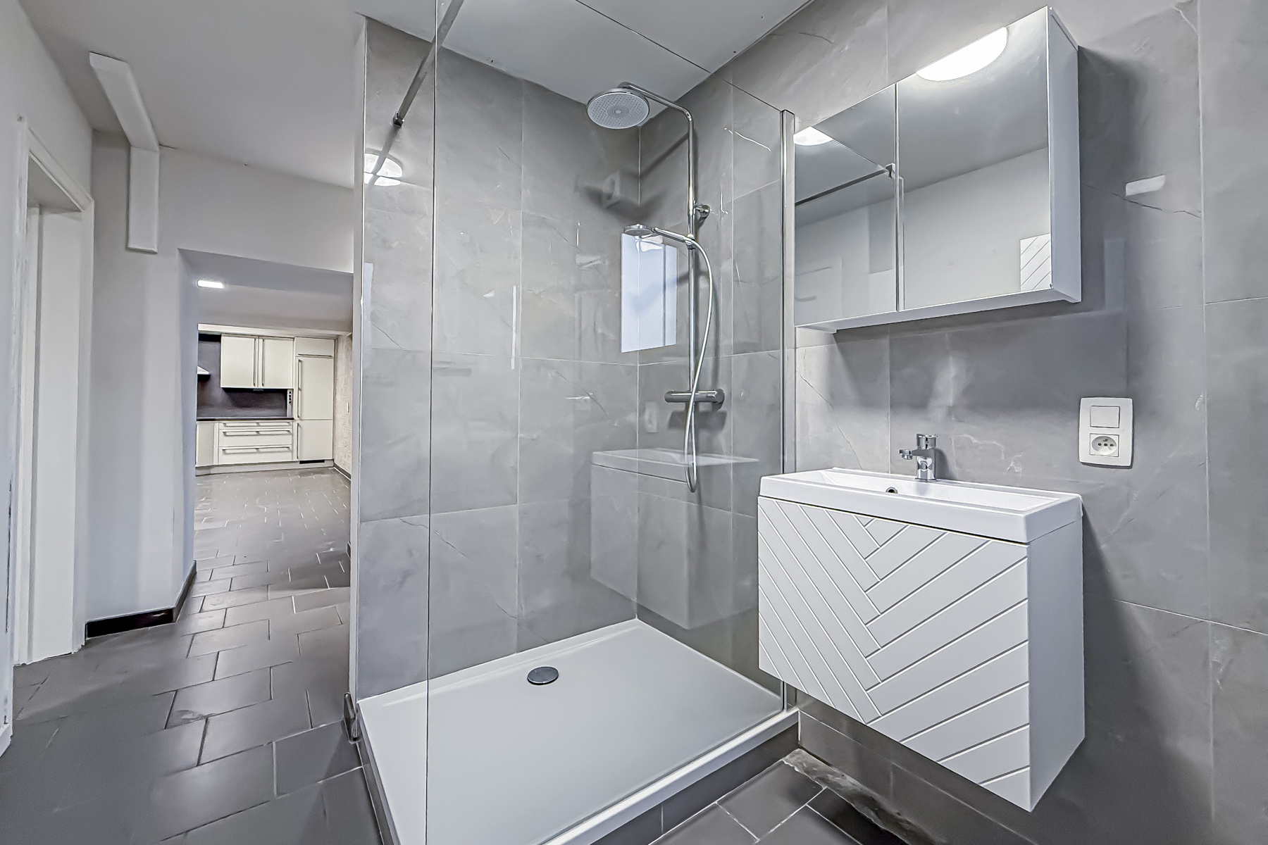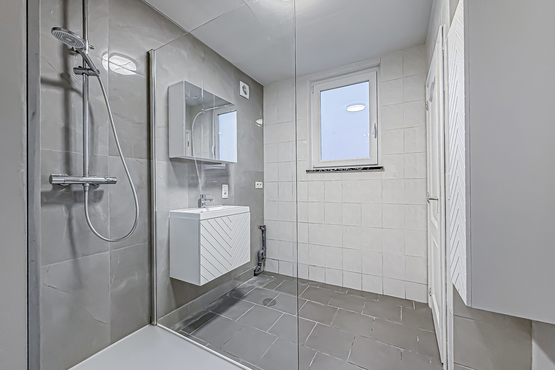 La salle de douche, rénovée avec soin, offre tout le confort nécessaire, tandis qu’un WC séparé renforce la fonctionnalité de l’ensemble.
